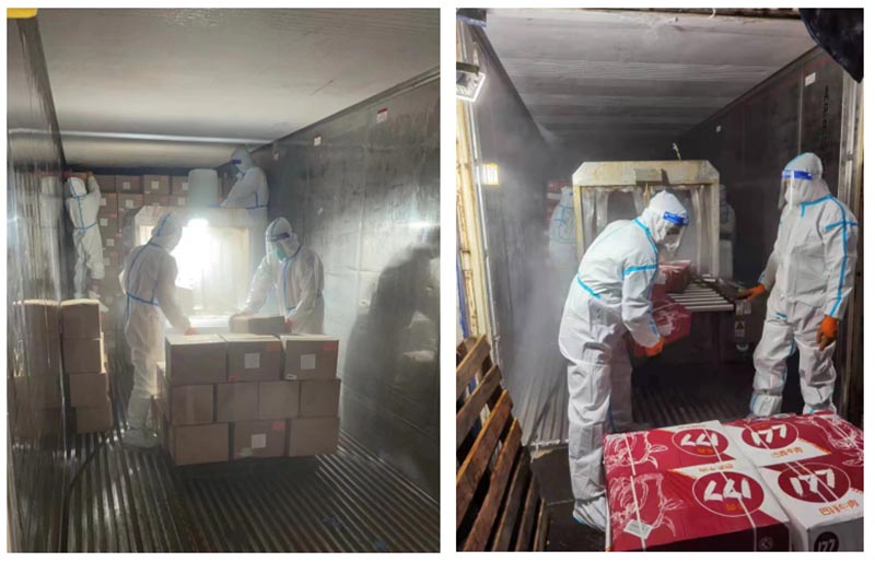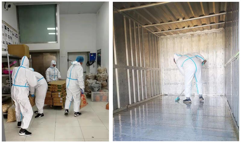 天緣物流集中監管倉的同志們始終堅守在一線,日復一日的按照流程穿戴各種防護用品,忍受著汗水包裹在悶熱難耐的防護服里,嚴格遵照進口凍品出入集中倉標準,全方位的進行貨品消毒、裝卸堆碼、理貨清點、車輛消毒。監管倉自開倉以來,大家都有一個簡單而堅定的信念:做好自己的防護工作,把貨物徹底消毒,安全入倉,直至最后出倉交付至貨主手中,全力保證監管倉始終安全高效運行。